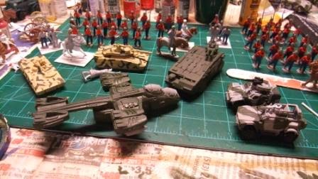 The painting work space is a little crowded right now with CMG grav vehicles, 28mm Sikhs, armored cars (Rebel Mini's and Matchbox) and the big APC and gunship models all competing for space.