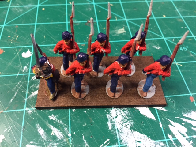 | This stand shall be blue turbans with yellow facings. I'm thinking the blue turban is almost too dark. Perhaps I should use the color of the trousers on the figure in the lower right? |